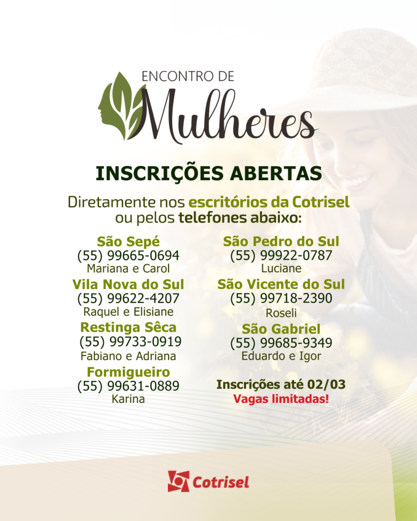 As inscrições podem ser realizadas até 02/03/2026, diretamente nos escritórios da Cotrisel ou pelos telefones abaixo: