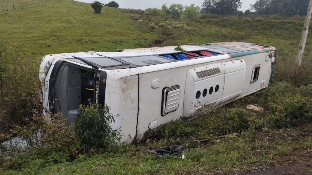 Um ônibus saiu da pista e tombou no km 214 da RSC-287, na localidade de Santuário, interior de Restinga Sêca, por volta das 7h40 desta terça-feira (16).