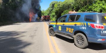 Carreta incendeia na BR 158 em Santa Maria