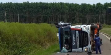 Carreta tomba na BR 158 que liga Rosário do Sul e Santa Maria