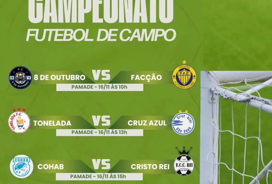 A Secretaria de Esporte e Lazer realiza neste domingo, 16 de novembro, mais uma rodada do Campeonato Municipal de Futebol de Campo, no campo do PAMADE.