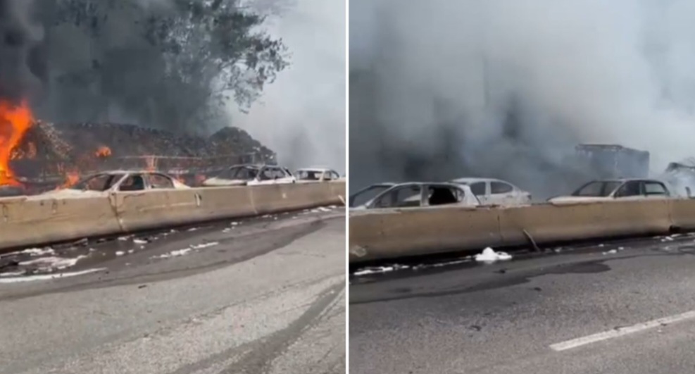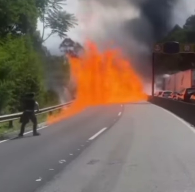 O fogo atingiu o veículo que transportava o produto perigoso e também se espalhou para outros veículos que estavam sobre a via, incluindo carros que estavam parados por conta da interdição causada pelo acidente.