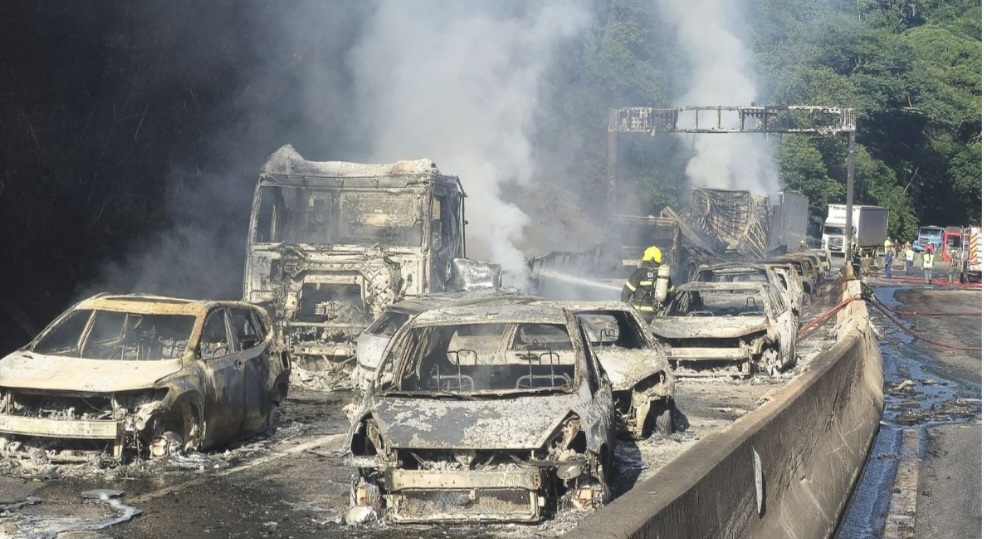 Segundo o Corpo de Bombeiros, em balanço feito junto com a Arteris Litoral Sul foram contabilizados 22 carros e três carretas atingidos pelo fogo. A Polícia Rodoviária Federal (PRF), Corpo de Bombeiros e Arteris atuam no local.