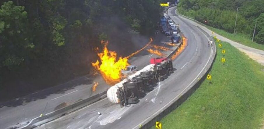 Carreta tomba no Morro dos Cavalos em Santa Catarina e 25 veículos incendeiam