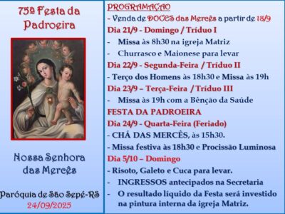 A Paróquia Nossa Senhora das Mercês, em São Sepé-RS, convida a todos/as para a 75ª FESTA DA PADROEIRA NOSSA SENHORA ...Prefeitura de Vila Nova do Sul reforça frota de veículos