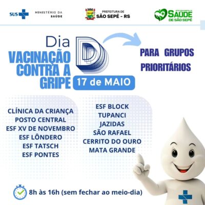 A Secretaria de Saúde informa que no próximo sábado, 17 de maio, haverá o dia D para a Vacinação contra ...