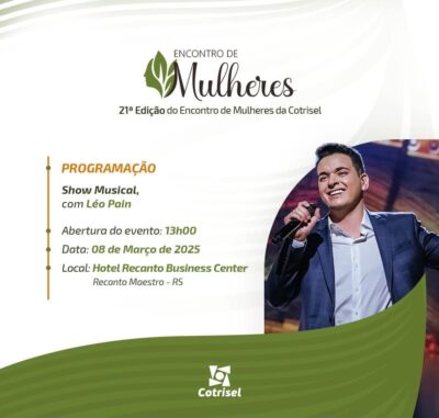O Encontro de Mulheres da Cotrisel será ainda mais especial com a presença do Léo Pain, Campeão do The Voice ...Liberado trânsito em Vila Nova do Sul