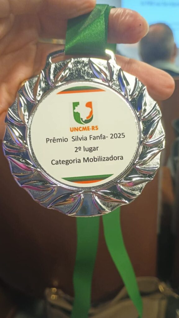 O CME conquistou o 2º lugar na categoria Mobilizadora, destacando-se por ações que incentivam a participação, o diálogo e a mobilização da comunidade em defesa da educação pública. A medalha e o certificado foram entregues durante o Seminário Técnico da UNCME-RS, em Porto Alegre, à coordenadora regional da AM Centro, Rosalia Silveira, e recebidos oficialmente no dia 4 de dezembro pela presidente do Conselho, Elenice Silveira.