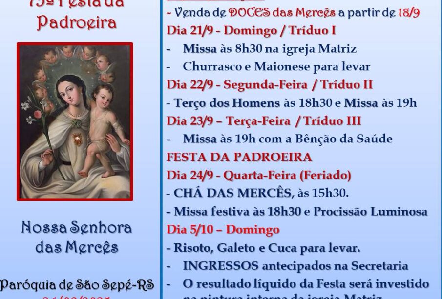 – Venda dos tradicionais DOCES DAS MERCÊS, a partir de 18/9, no Salão Paroquial.