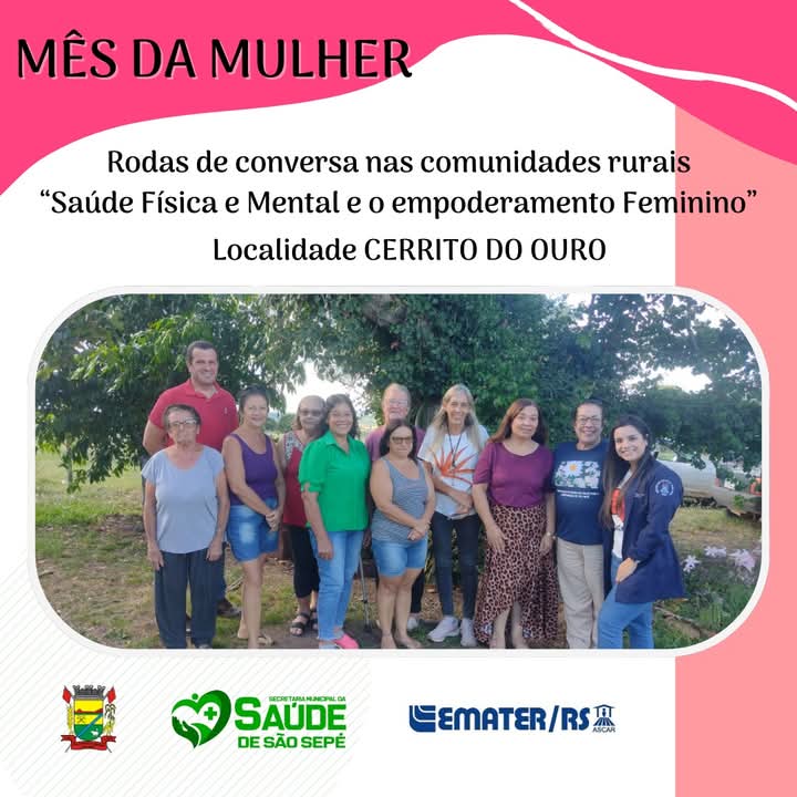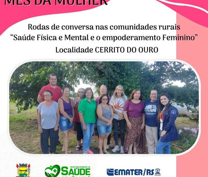 Emater/RS Ascar, Sindicato dos Trabalhadores Rurais e Secretaria Municipal de Saúde, com a presença da enfermeira Maria Helena Pontes, deram continuidade às ações do mês de março, em homenagem ao dia internacional da mulher. Foi realizada uma roda de conversa no interior do município, dessa vez na localidade do Cerrito do Ouro, onde foram abordados temas essenciais para o cuidado da saúde feminina.