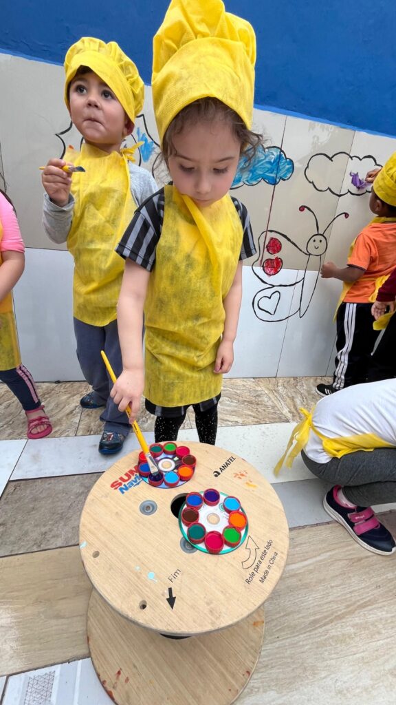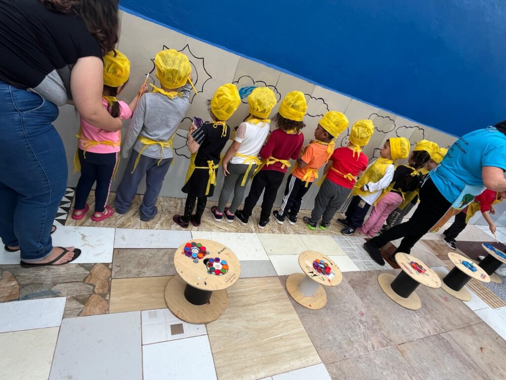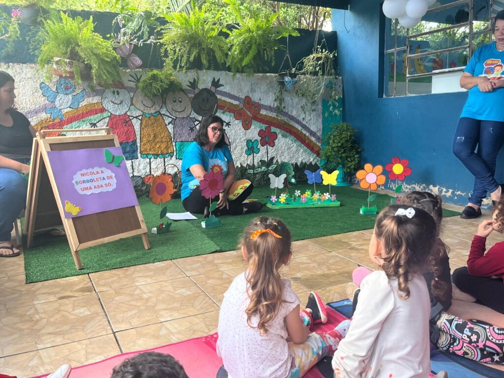 Durante o evento, houve a contação de histórias “Nicola, a Borboleta de Uma Asa Só”, conduzida pela professora Eoelma Cunha. Após a atividade, o Maternal B2 expressou sua criatividade por meio de pinturas inspiradas na história, utilizando o novo espaço.