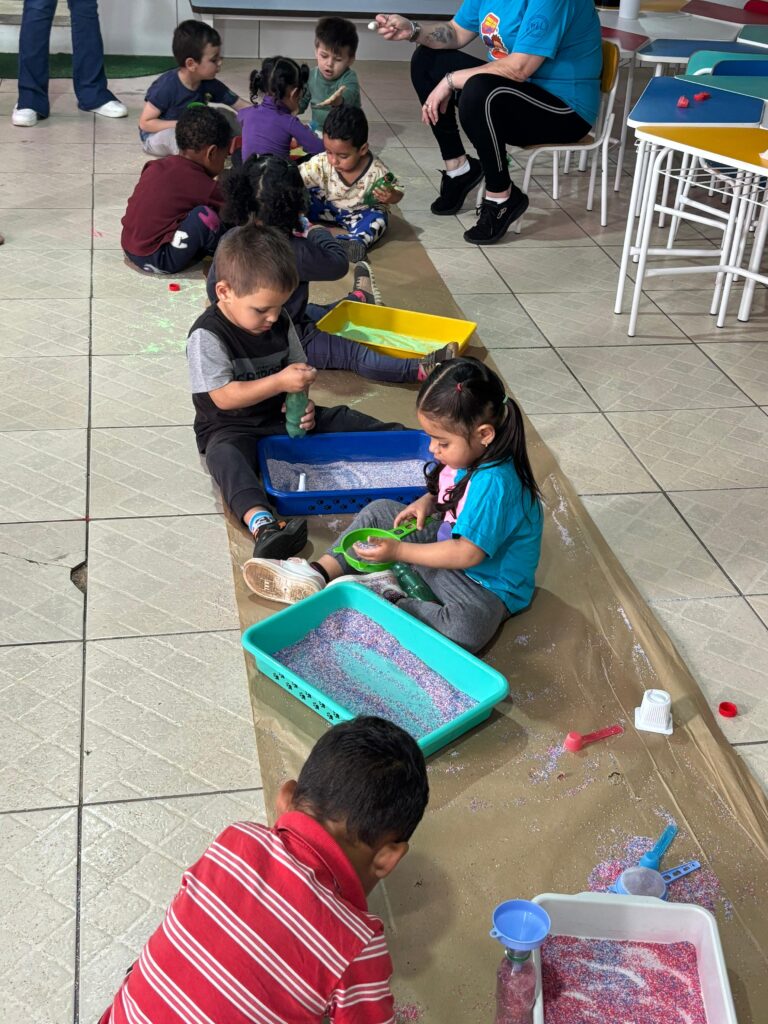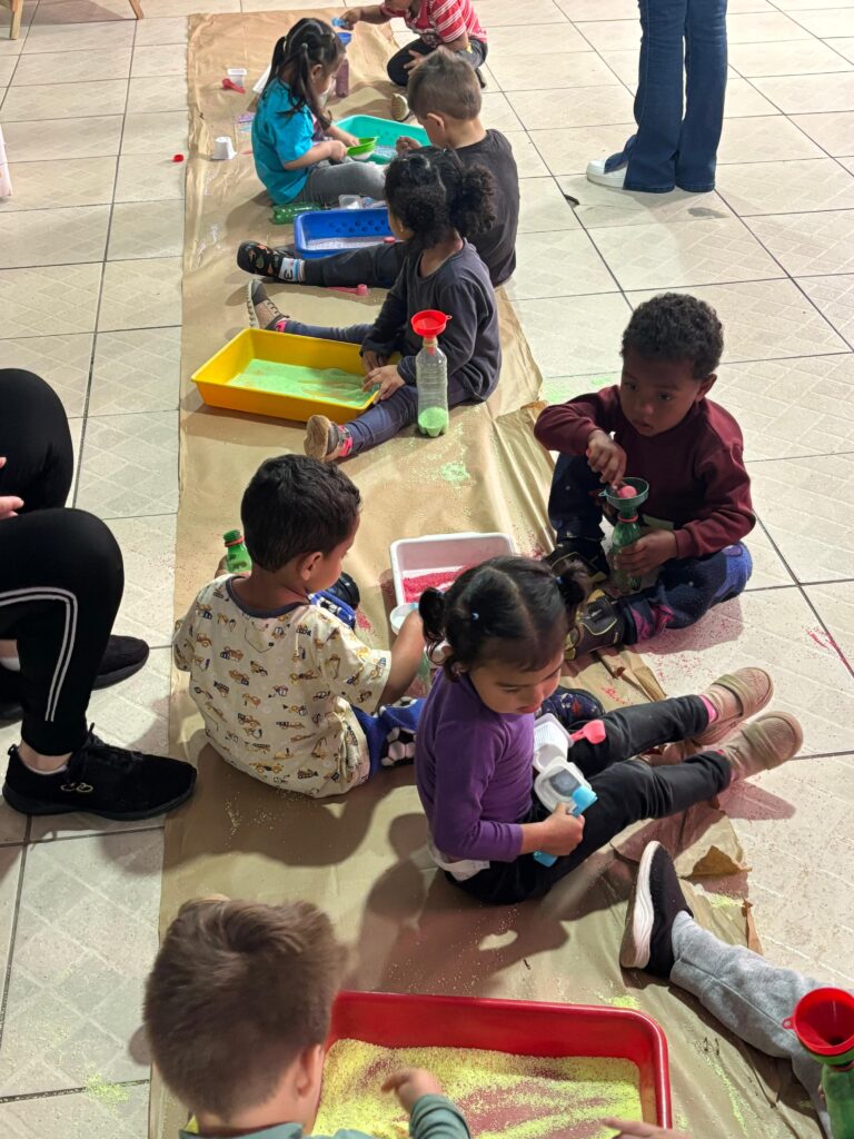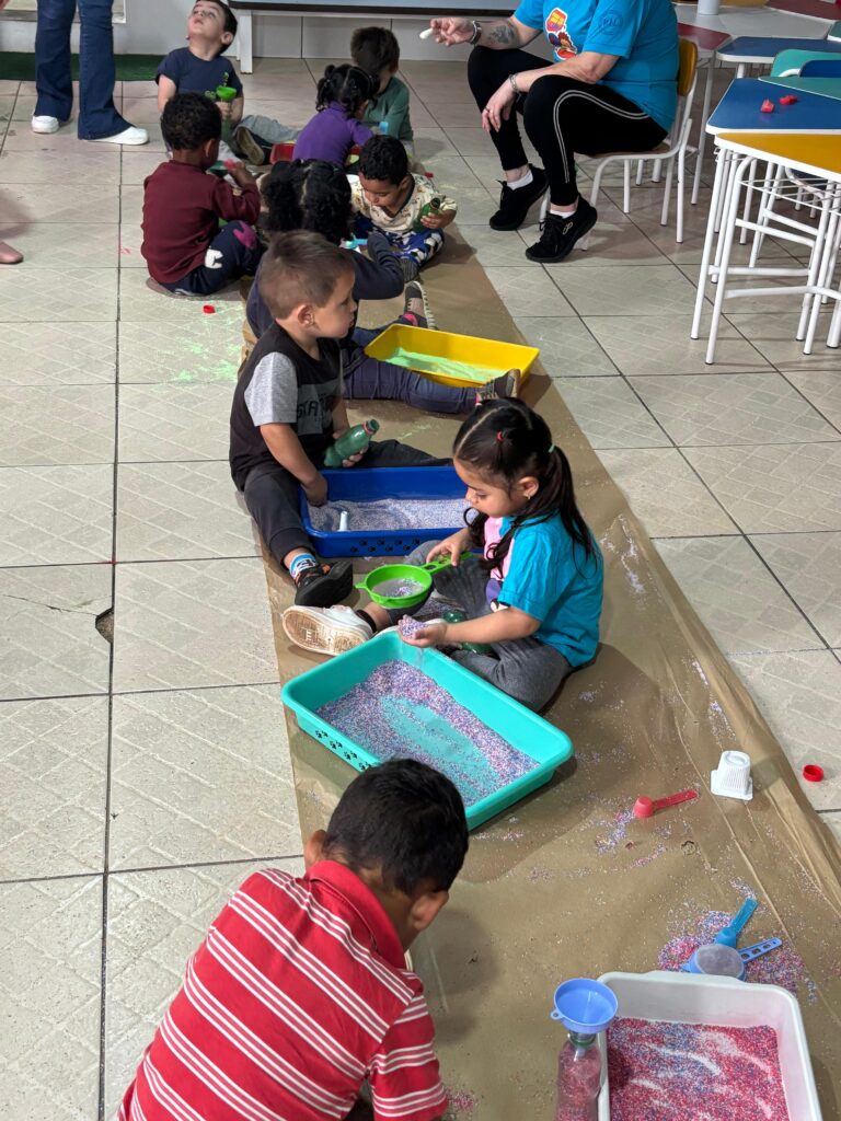 No Espaço Kids, as turmas do Berçário 1 e Berçário 2 encantaram os presentes com a música “O Barulhinho do Feijão e do Arroz”, apresentando habilidades com instrumentos musicais reciclados. A professora Vanessa Seixas também promoveu uma bela atividade de exploração com areia colorida.