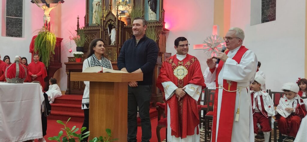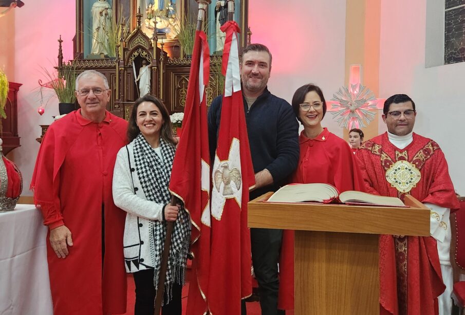 Durante a cerimônia, o casal de festeiros de 2025, Sérgio e Márcia Silveira, foi homenageado em reconhecimento ao trabalho e dedicação junto à comissão organizadora da festa.