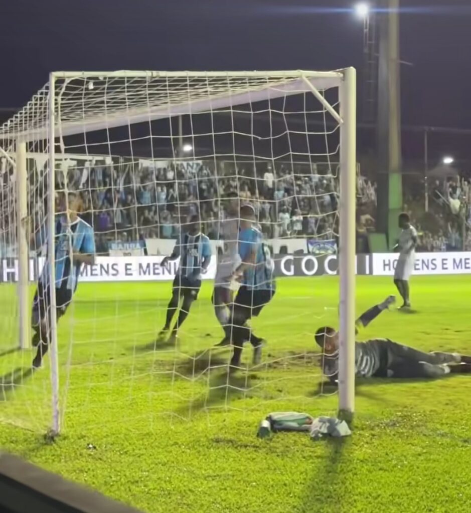 Aos 33 minutos, a resposta gremista. Tiago lançou para Amuzu pelo lado esquerdo de ataque. Ele dominou e partiu em velocidade para cima da marcação. Logo balançou o corpo e arriscou forte chute. A bola passou tirando tinta da trave direita.