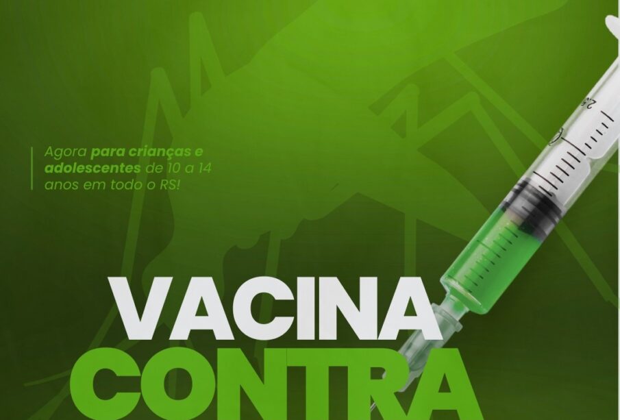 A Secretaria de Saúde informa que a imunização contra a dengue para crianças e adolescentes de 10 a 14 anos foi ampliada para todo o Rio Grande do Sul.
