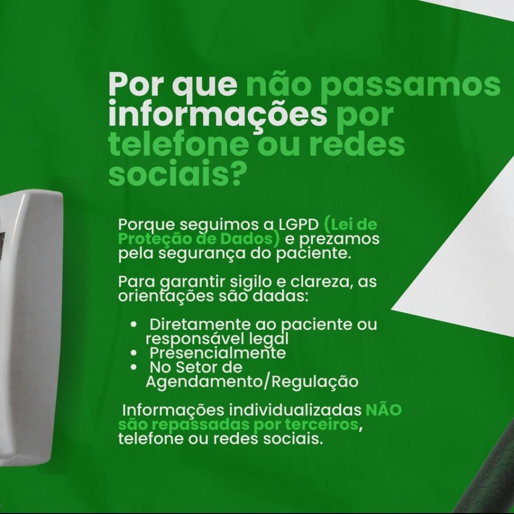 Por esse motivo, em conformidade com a Lei Geral de Proteção de Dados (Lei nº 13.709/2018 – LGPD), as orientações são fornecidas exclusivamente de forma presencial, diretamente ao paciente ou ao seu responsável legal. A medida garante clareza nas informações, proteção da privacidade e organização adequada do atendimento.