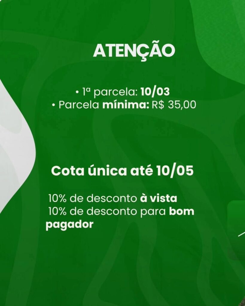 Também é possível optar pelo parcelamento em até 10 vezes, com vencimentos sempre no dia 10 de cada mês. Para quem aderir após o início do calendário (primeira parcela em 10 de março), o pagamento será feito com incidência de multa e juros.