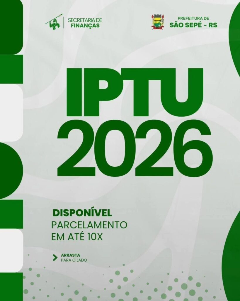 A Prefeitura de São Sepé informa que o prazo para pagamento do IPTU em cota única com desconto foi prorrogado até o dia 10 de maio.