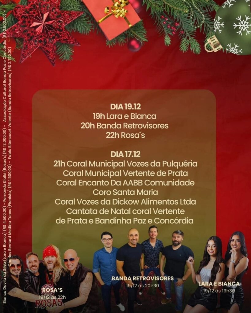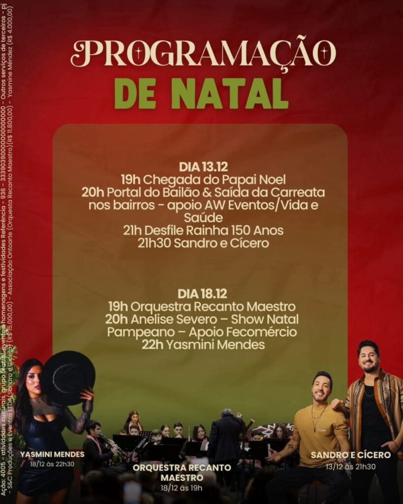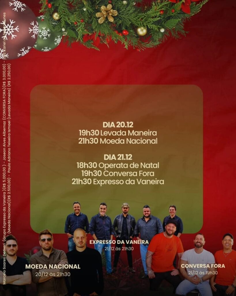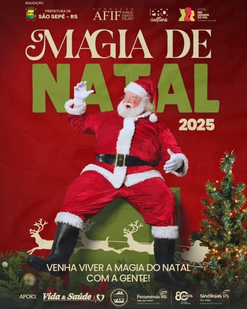 A Prefeitura Municipal, em parceria com a Fundação AFIF e o Pró-Cultura RS, convida toda a comunidade para celebrar essa época especial, repleta de luz, alegria e encanto. A programação abre neste sábado com a chegada do Papai Noel e shows musicias.