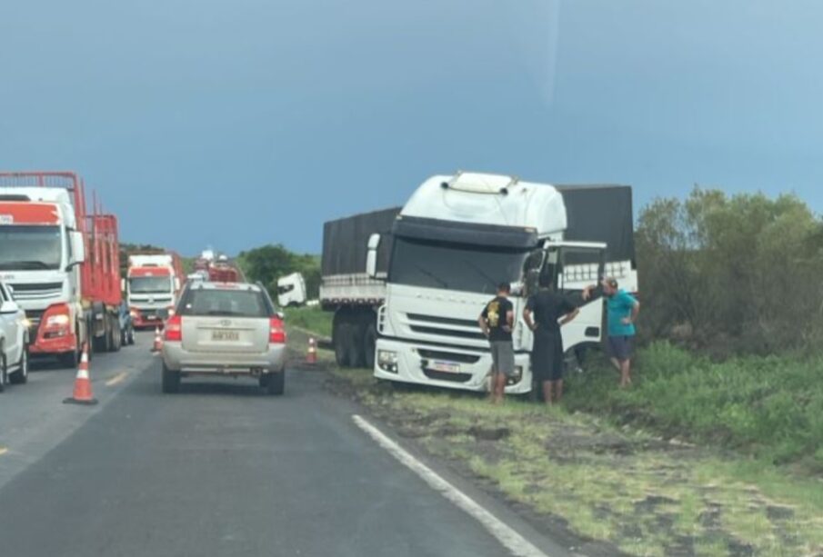Atenção motoristas que trafegam pelo BR 290 trecho entre São Sepé e Vila Nova do Sul. Trânsito lento devido a um acidente com uma carreta. O motorista perdeu o controle do veículo que teve saída parcial de pista. Ninguém se feriu. Longas filas de veículos se formou nos dois sentidos.
