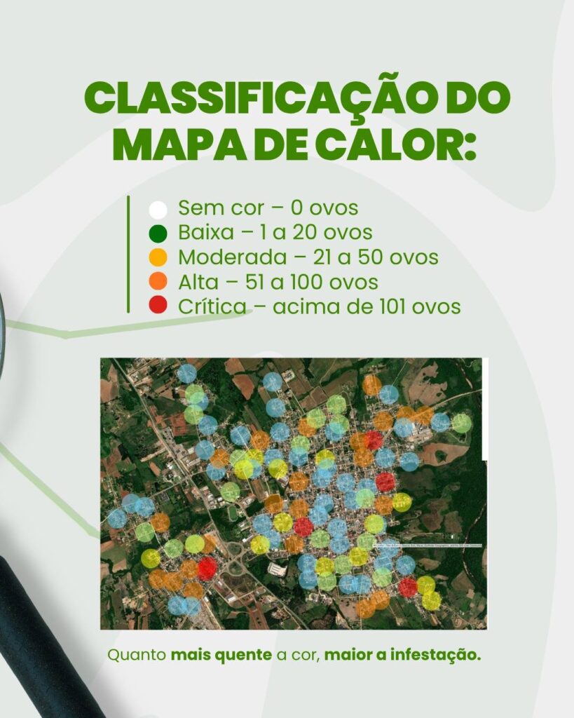 A Secretaria Municipal de Saúde, por meio das Vigilâncias Sanitária e Epidemiológica, divulga o levantamento atualizado do monitoramento do Aedes aegypti, acompanhado do mapa de calor que indica a presença de ovos no município.