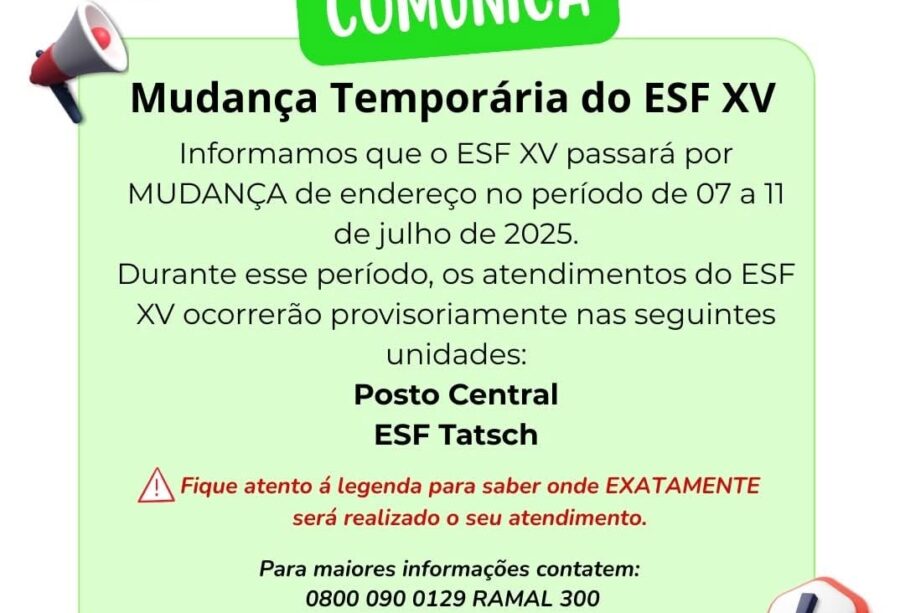 que, a partir do dia 07/07, a unidade ESF XV de Novembro estará realizando seus atendimentos em local provisório, juntamente com a unidade UBS Centro e ESF Tatsch.