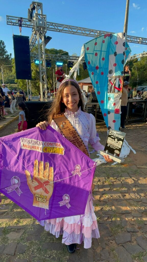 A estudante — e primeira prenda mirim da 5ª Região Tradicionalista — Joana Lopes conquistou o primeiro lugar na categoria menor pandorga e o segundo lugar na categoria maior pandorga durante o 50º Festival Binacional de Pandorgas, realizado em Santana do Livramento, a Fronteira da Paz, e levou-me de volta aos tempos de guri, lá no Irapuá, quando o céu era palco e o vento, parceiro de brincadeiras.