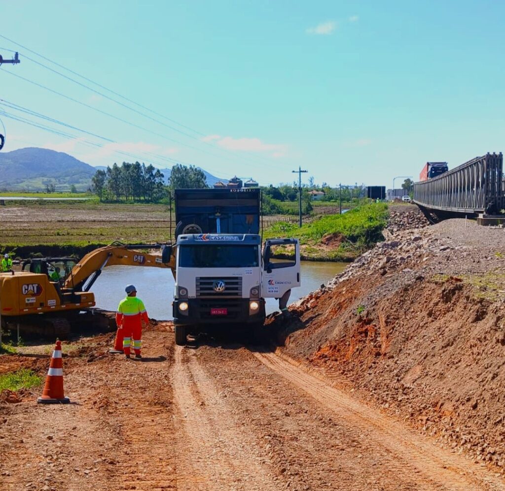 A Rota Santa Maria anunciou avançaram para uma nova etapa com a execução da limpeza e do aterro, que garantem o acesso dos equipamentos e permitem o início das fundações da nova ponte.