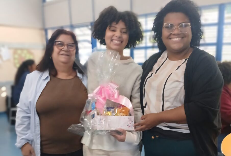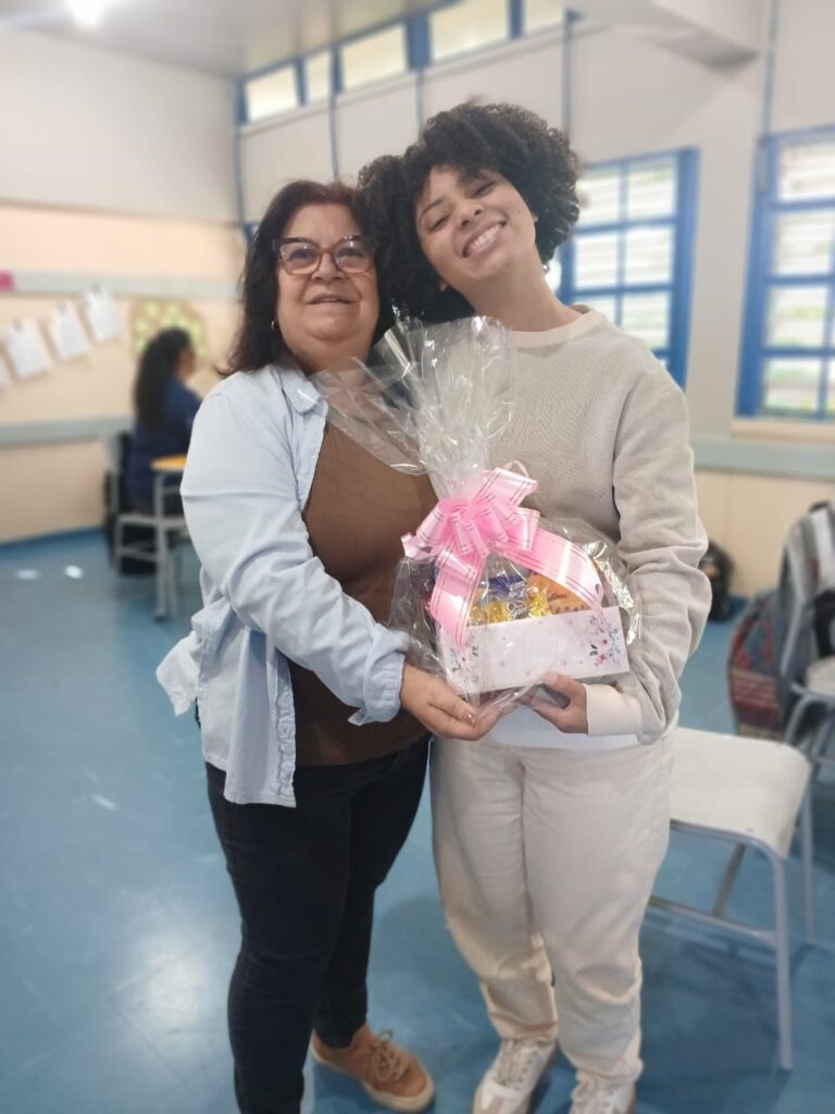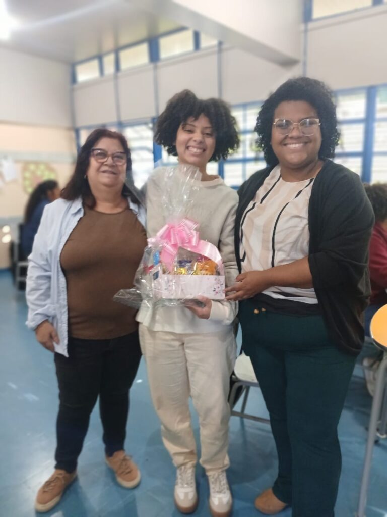 A aluna Cassandra Neves, que representou São Sepé na COP 30, realizada em Belém do Pará, foi recepcionada nesta manhã pela direção e pelos colegas ao retornar ao CIEP. Na foto, Cassandra aparece ao lado da diretora do CIEP, Rose Neves, e da diretora Cultural da Fundação Afif, Lara Cornélio.