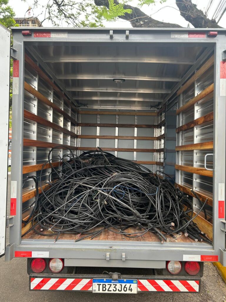 Restaram dois indivíduos presos em flagrante pelo crime de receptação qualificada de fios e cabos, totalizando 1,2 toneladas de fios apreendidos.