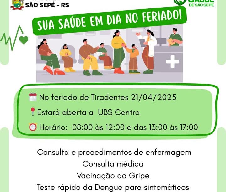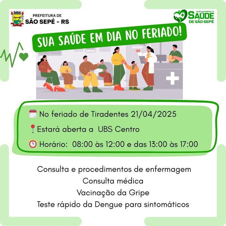 Pensando num melhor atendimento para a população e na sua saúde dos sepeenses, a equipe da UBS Centro de São Sepé, estará atendendo neste no feriado de Tiradentes, dia 21/04!