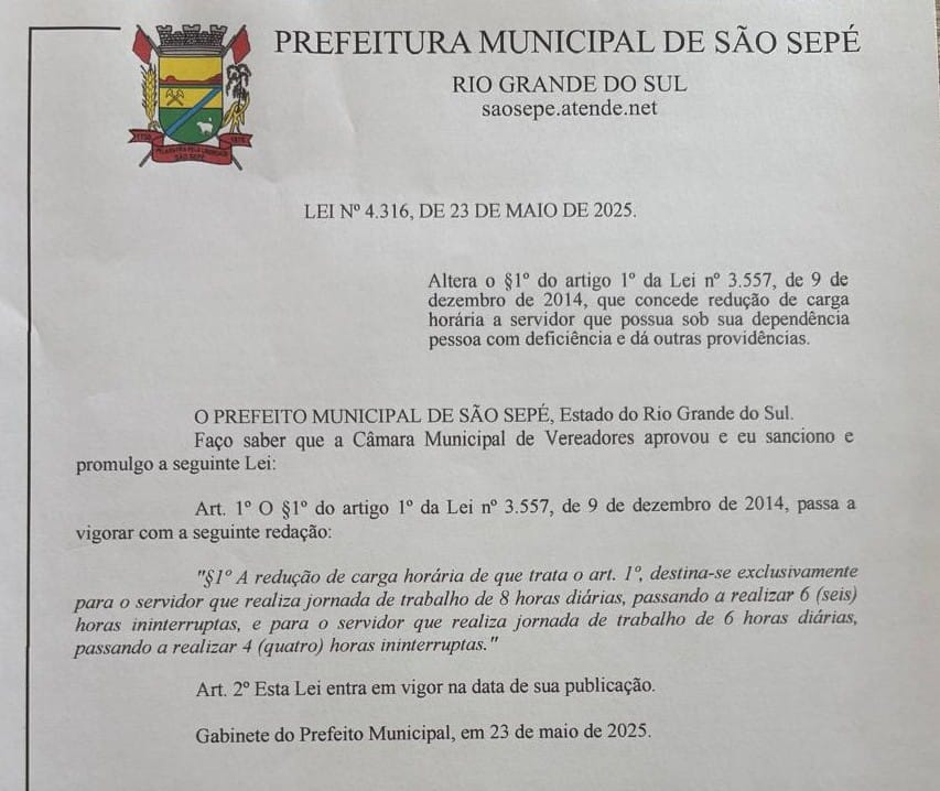 O prefeito de São Sepé sancionou, nesta sexta-feira (23), a Lei nº 4.316/2025, que altera o §1º do artigo 1º da Lei nº 3.557/2014. A nova legislação garante a redução da jornada de trabalho, sem prejuízo salarial, para servidores públicos municipais que tenham sob sua dependência pessoa com deficiência.