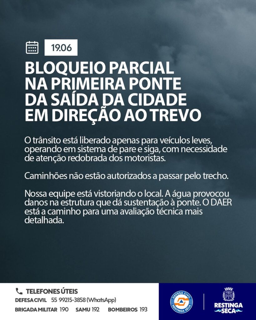 O trânsito na primeira ponte, na saída da cidade em direção ao trevo, está liberado apenas para veículos leves, operando no sistema de pare e siga.