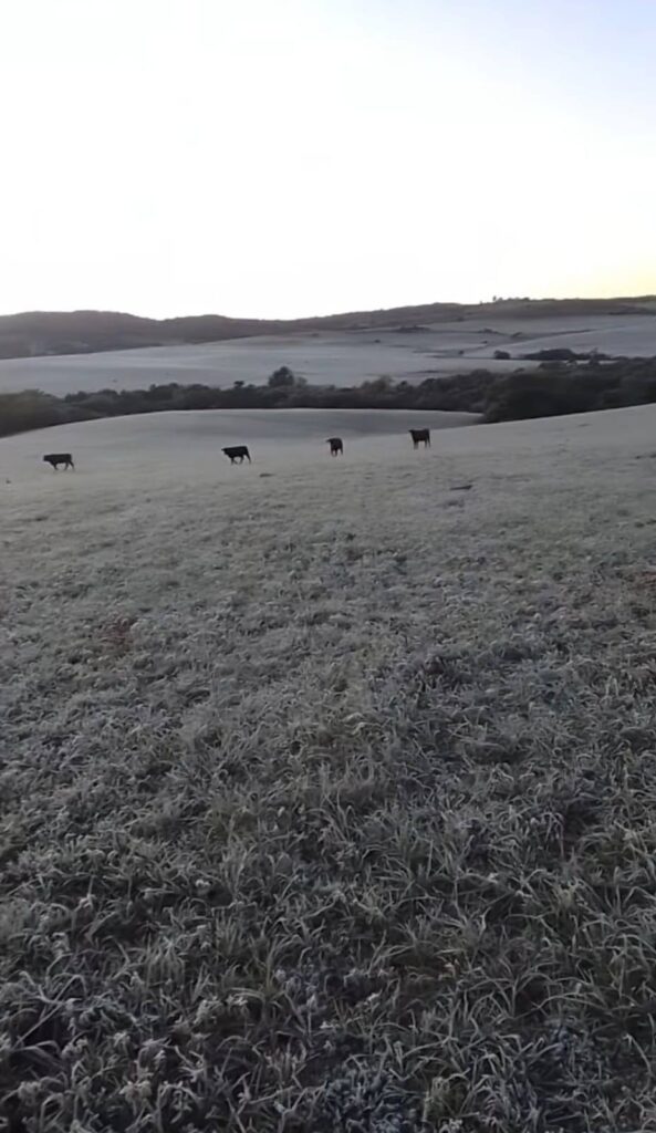 Em São Sepé a temperatura amanheceu em 2 graus, mas com sensação de muito mais frio. A geada foi observada até mesmo em partes mais altas, carros e campos ficaram cobertos pelo gelo.