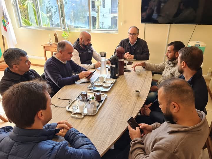 Na manhã de sexta-feira, 23 de maio, o prefeito Marcelo Ellwanger recebeu em seu gabinete os vereadores da base governista para mais uma reunião de alinhamento mensal. O encontro contou com a presença do vice-prefeito Rodrigo Ferreira e do procurador jurídico do município, Claudio Adão Amaral de Souza.