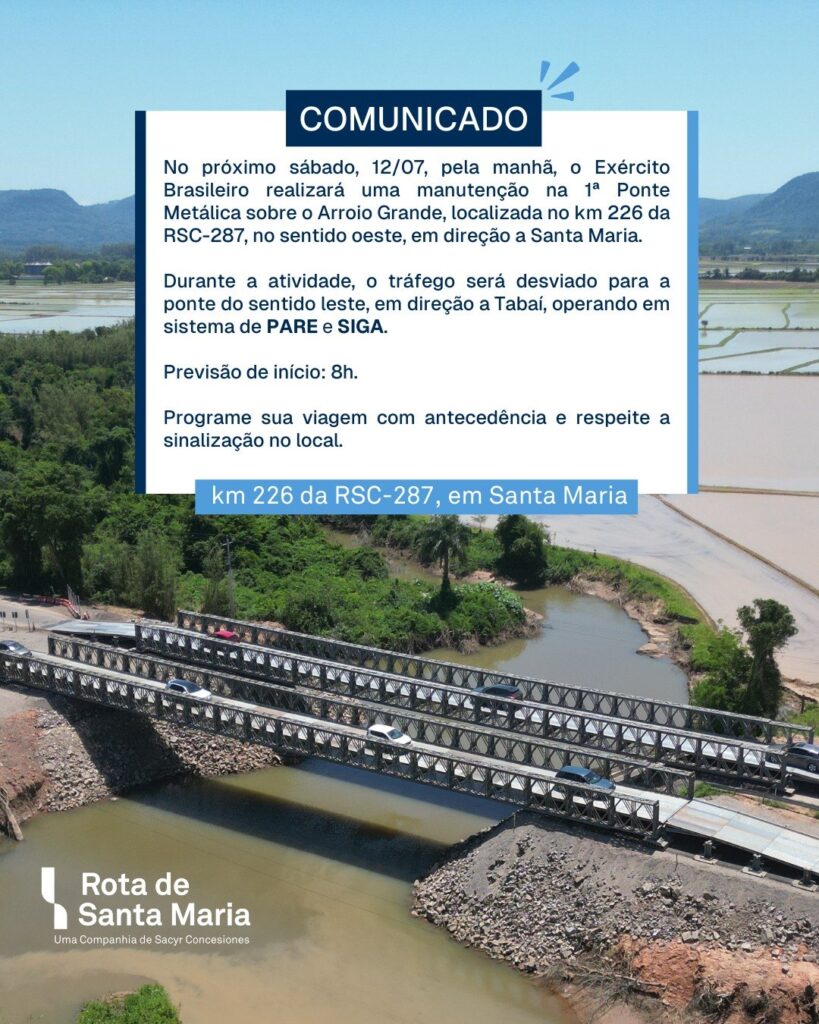 Neste sábado, 12/07, haverá manutenção na Ponte Metálica sobre o Arroio Grande no km 226 da RSC-287, sentido oeste, em direção a Santa Maria.