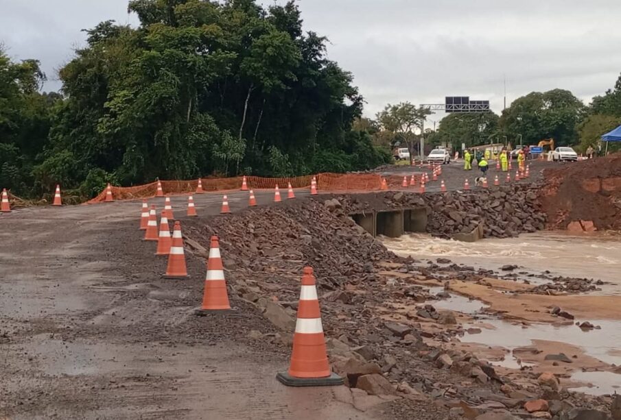 Atenção: Neste momento, a passagem será permitida apenas para veículos leves e caminhões de até 3 eixos. Carretas e veículos de maior porte seguem temporariamente proibidos de trafegar no local, até que a obra de recuperação seja totalmente concluída.