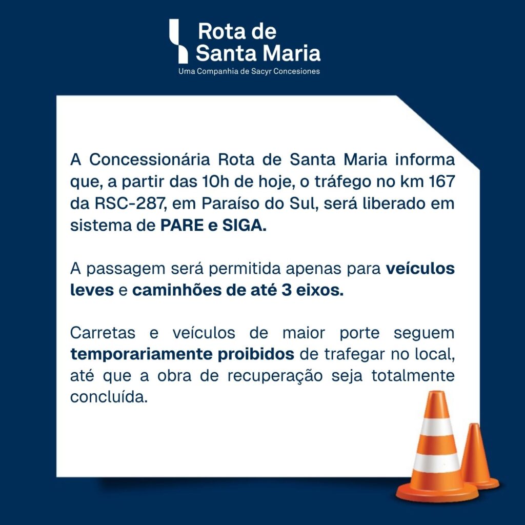 A Concessionária Rota de Santa Maria informa que, a partir das 10h de hoje, o tráfego no km 167 da RSC-287, em Paraíso do Sul, será liberado em sistema de PARE e SIGA.