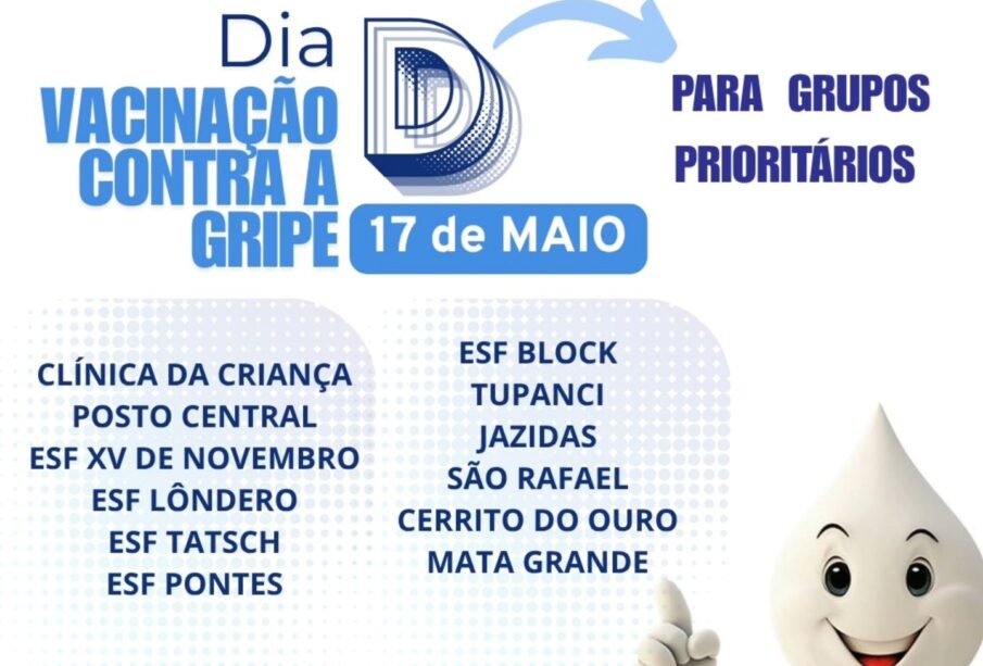 A Secretaria de Saúde informa que no próximo sábado, 17 de maio, haverá o dia D para a Vacinação contra a Influenza (gripe).