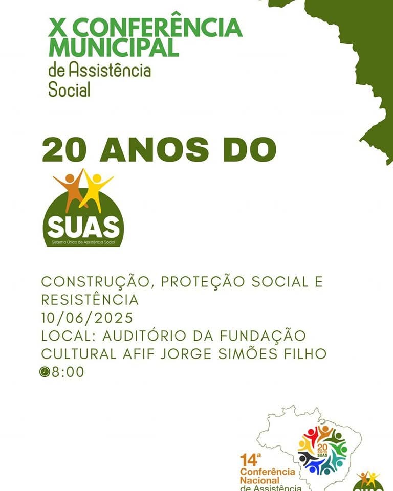 No próximo dia 10 de junho, o auditório da Fundação Cultural Afif Jorge Simões Filho será palco de um importante momento para o nosso município: a 10ª Conferência Municipal de Assistência Social, com o tema: