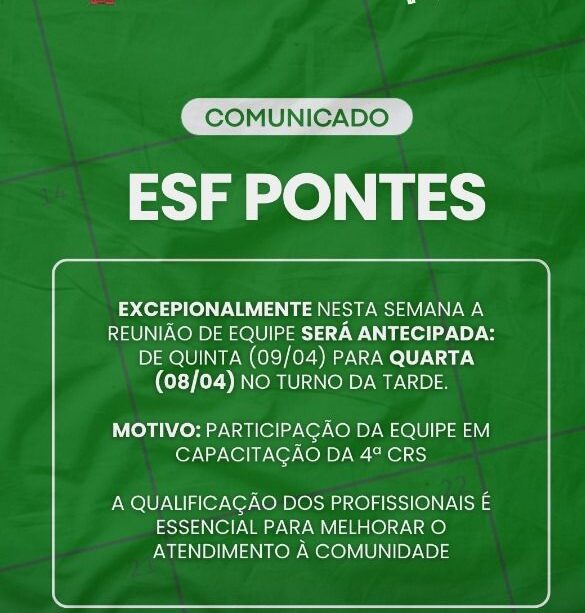 A secretaria de Saúde informa que, de forma excepcional nesta semana, haverá alteração no cronograma de funcionamento da ESF Pontes.