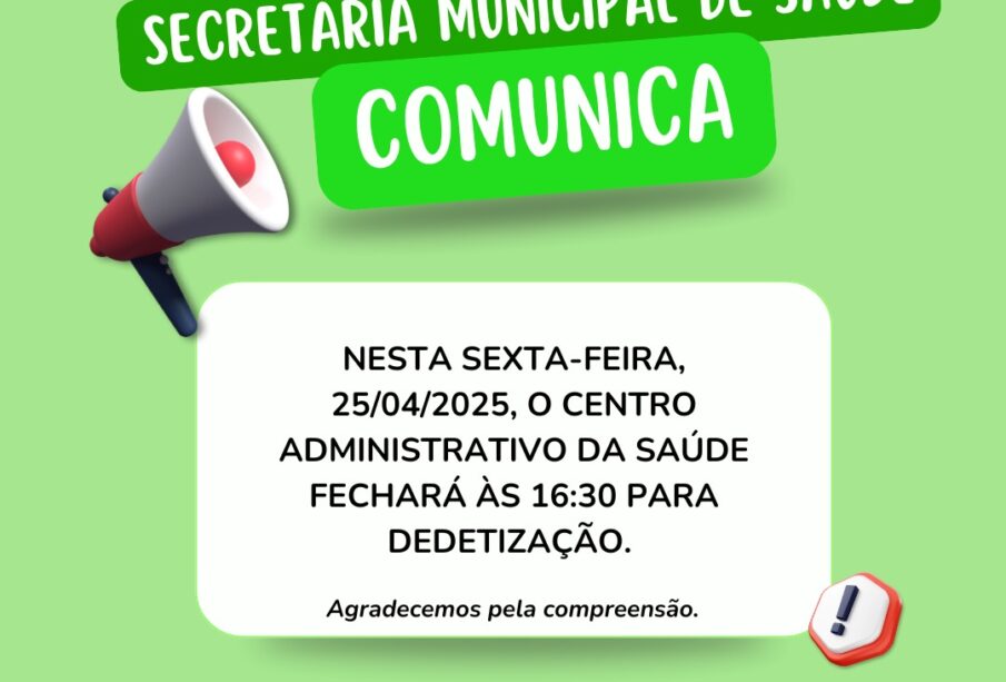 Na próxima sexta-feira, 25 de abril de 2025, o Centro Administrativo da Saúde encerrará suas atividades às 16h30 para a realização de dedetização preventiva. A ação visa garantir um ambiente seguro para servidores e usuários.