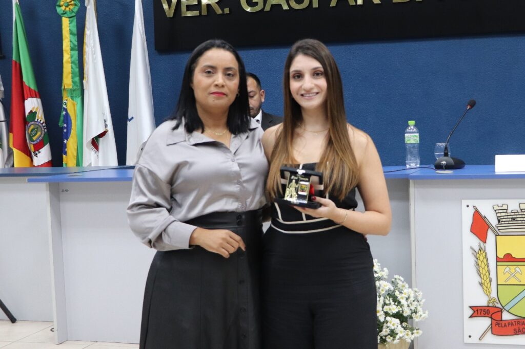 Por fim, a médica Hyngrid Santos Sousa foi homenageada com a Medalha Sepé Tiaraju, em reconhecimento ao seu trabalho na área da saúde. Aos 28 anos, Hyngrid atua há um ano e meio no Hospital Santo Antônio, na UBS Centro, na Clínica Vida e Saúde e no Asilo São Vicente de Paulo. A indicação foi feita pela vereadora Vladia Freitas de Oliveira (PDT), por meio do Projeto de Decreto Legislativo 03/2025, com apoio dos demais vereadores.