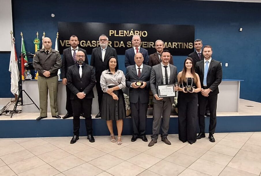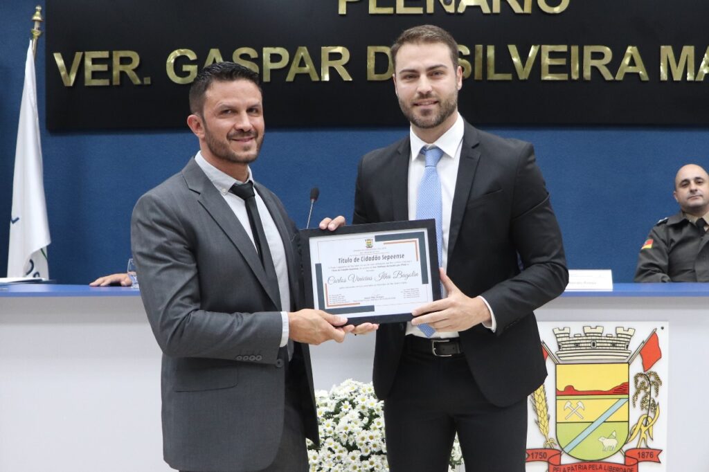 O primeiro homenageado da noite foi o empresário Carlos Vinicius Ilha Bagolin, que recebeu o Título de Cidadão Sepeense. Natural de Santa Maria, Vinicius reside em São Sepé há 25 anos, onde construiu sua trajetória pessoal e profissional. Formado em Ciências Contábeis, é proprietário da Loja Casual, contribuindo para o crescimento econômico local. A homenagem foi concedida por meio do Projeto de Decreto Legislativo 01/2025, de autoria do vereador Matheus de David Leão (PSB), com apoio dos demais parlamentares.