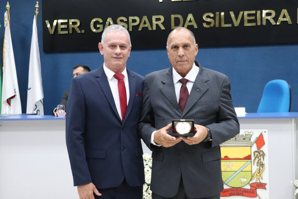 Em seguida, Edison Luiz Marques de Deus recebeu a Medalha Diego Veiga dos Santos. Policial Militar da reserva, com patente de 1º Tenente, Edison comandou o Pelotão de Policiamento de São Sepé por diversos anos. É também ativo em entidades comunitárias como o Rotary Club, a Loja Maçônica Paz e Labor, a APAE e o Conselho Paroquial da Igreja Nossa Senhora das Mercês. Atualmente, preside o Conselho Comunitário Pró-Segurança Pública (CONSEPRO). Sua homenagem foi aprovada por meio do Projeto de Decreto Legislativo 04/2025, por indicação da Mesa Diretora da Câmara.
