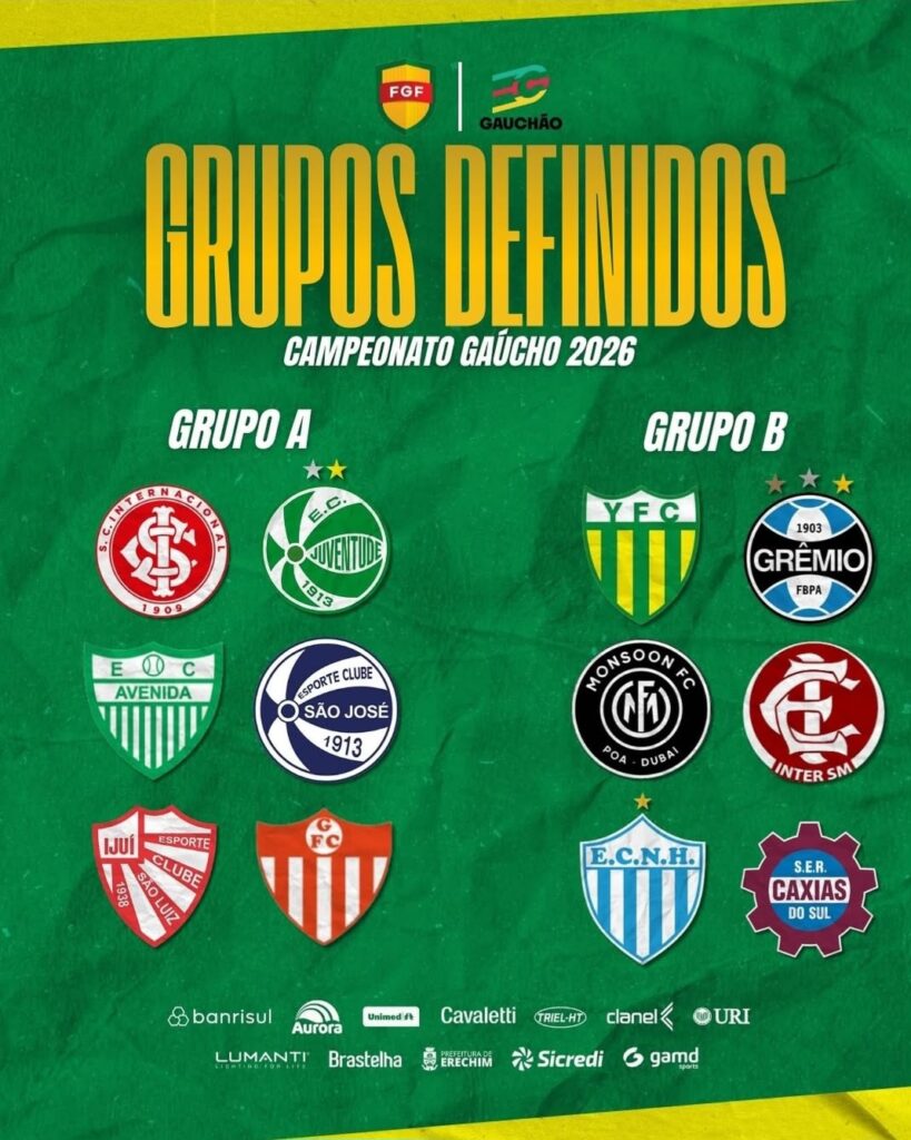 A Federação Gaúcha de Futebol (FGF) divulgou, durante comitê técnico realizado na tarde desta segunda-feira (10), os grupos e a nova fórmula do Campeonato Gaúcho de 2026. Grêmio, Internacional e Juventude conheceram seus caminhos na competição estadual.