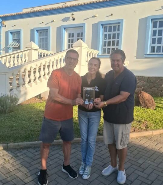 Após o meio-dia, nos deslocamos à Pousada Olival Vila do Segredo, onde a funcionária Andriele e os proprietários Renato e Cinara (foto), e seu filho Rafael, nos receberam com a acolhida calorosa de quem nos faz sentir à vontade como velhos conhecidos, enquanto assistiam ao especial do JA, da RBS TV, sobre as belezas do lugar, com sua pitoresca plantação de oliveiras. Soubemos que Elzinga esteve por lá e, naquele dia, a Rolê Família — os irmãos Bruno e Paula, acompanhados da mãe, Marta Rist — estava produzindo documentário para seu canal no YouTube e Instagram.