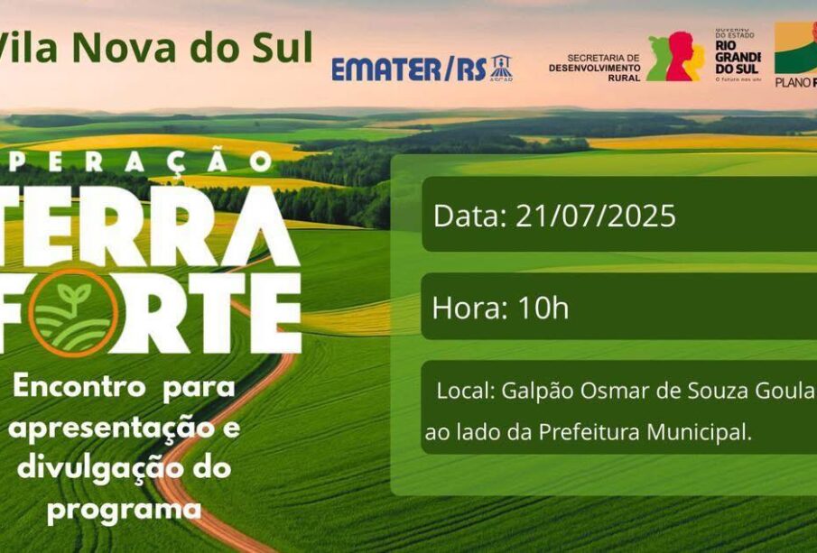 A Secretaria Municipal de Agricultura e Meio Ambiente, em parceria com a EMATER, convida todos os agricultores de Vila Nova do Sul para uma reunião de divulgação do Programa de Recuperação Socioprodutiva e Ambiental e Incremento da Resiliência Climática da Agricultura Familiar Gaúcha – Operação Terra Forte.